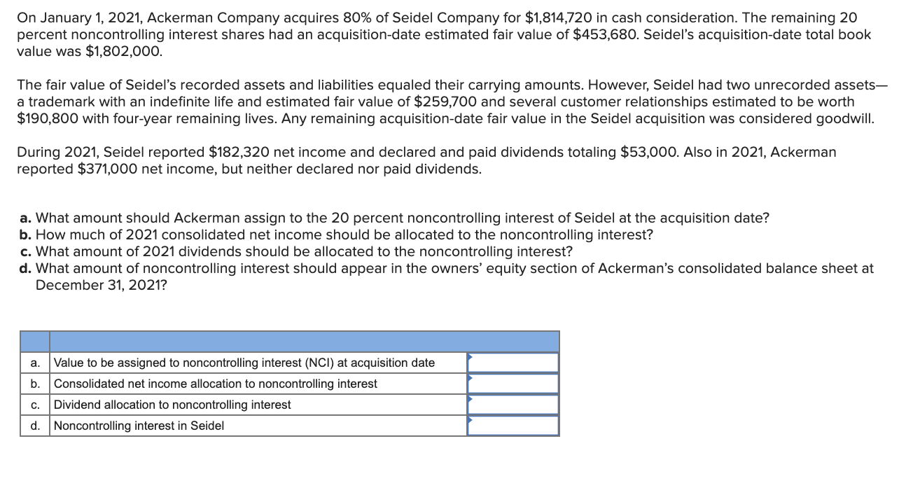 Solved On January 1, 2021, Ackerman Company acquires 80% of ...